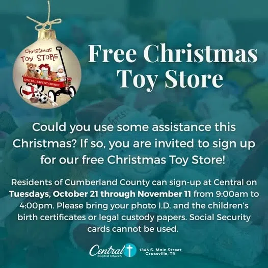 Crossville, TN – Could you use some assistance this Christmas? If so, Central Baptist Church invites you to sign-up for their annual free Christmas Toy Store to be held in December.