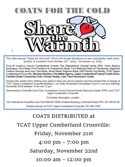 Coats will be distributed free of charge to anyone who needs warm clothing at TCAT Upper Cumberland Crossville Building 1 on Friday, November 21st between 4pm and 7pm, and Saturday, November 22nd from 10am to Noon.
