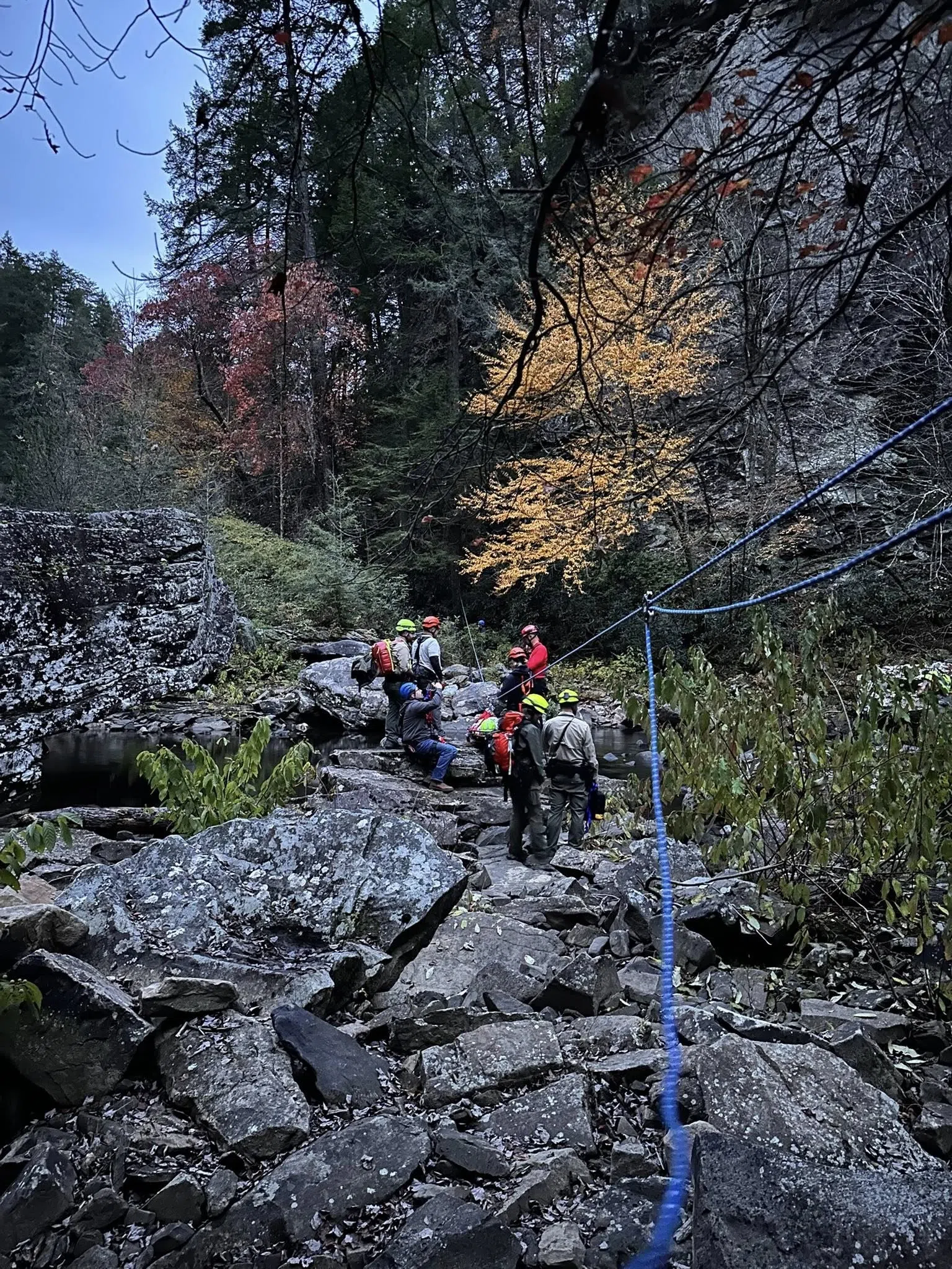 The Piney Volunteer Fire Department in Van Buren County was dispatched to Fall Creek Falls State Park after 2pm Saturday (Nov. 1. 2025) for a person who had a medical emergency and was located about 1,000 feet down creek from Cable Trail. Numerous other agencies from nearby counties also responded. Due to the patient’s condition and difficulty of extraction, the Tennessee Helicopter Aquatic Rescue Team (TN-HART) was called to lift the patient out of the gorge. White County EMS transported the patient to a local hospital. (Photo courtesy Piney Volunteer Fire Department.)