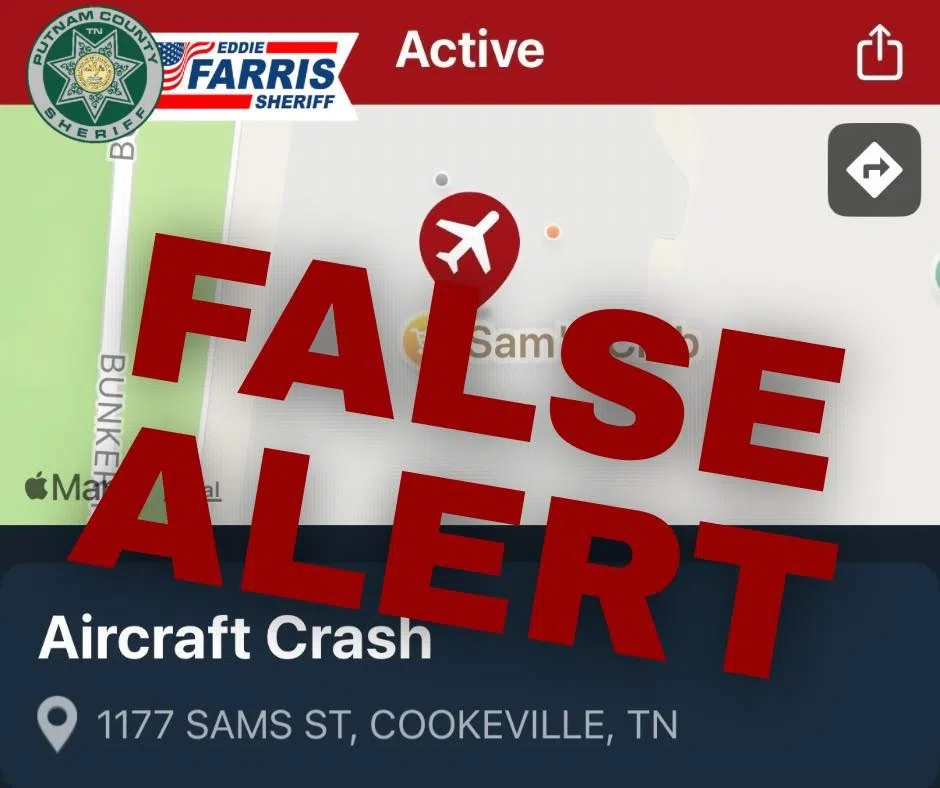 The Putnam County Sheriff’s Office said there was no plane crash at Sam’s Club in Cookeville on Wednesday morning (11/5/2025). A PulsePoint notification was sent out alerting of a plane crash. The Sheriff’s Office said it was an accidental false entry. No other details regarding the incident were provided. (Image courtesy PCSO.)