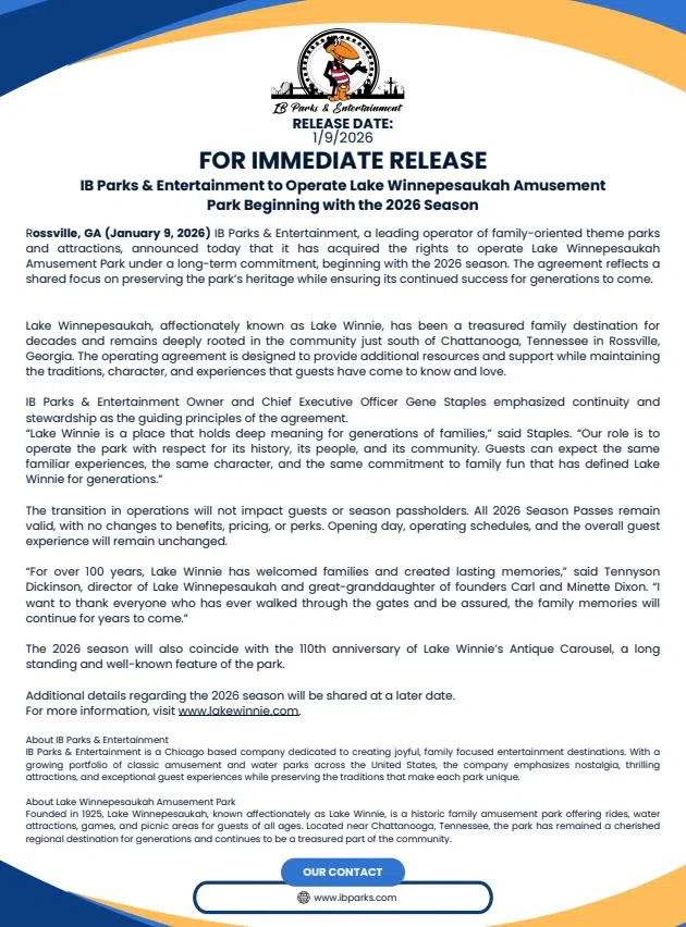 Lake Winnepesaukah Amusement park in Rossville, Georgia has new operators.  IB Parks & Entertainment, based out of Chicago, announced Friday (1/9/2026) that it has acquired the rights to run Lake Winnie under a long-term commitment, beginning with the 2026 season.  The new operator said the transition will not impact guests of the theme park, which is about 6 miles south of Chattanooga.  All 2026 Season Passes remain valid and opening day, operating schedules and the overall guest experience will remain the same.