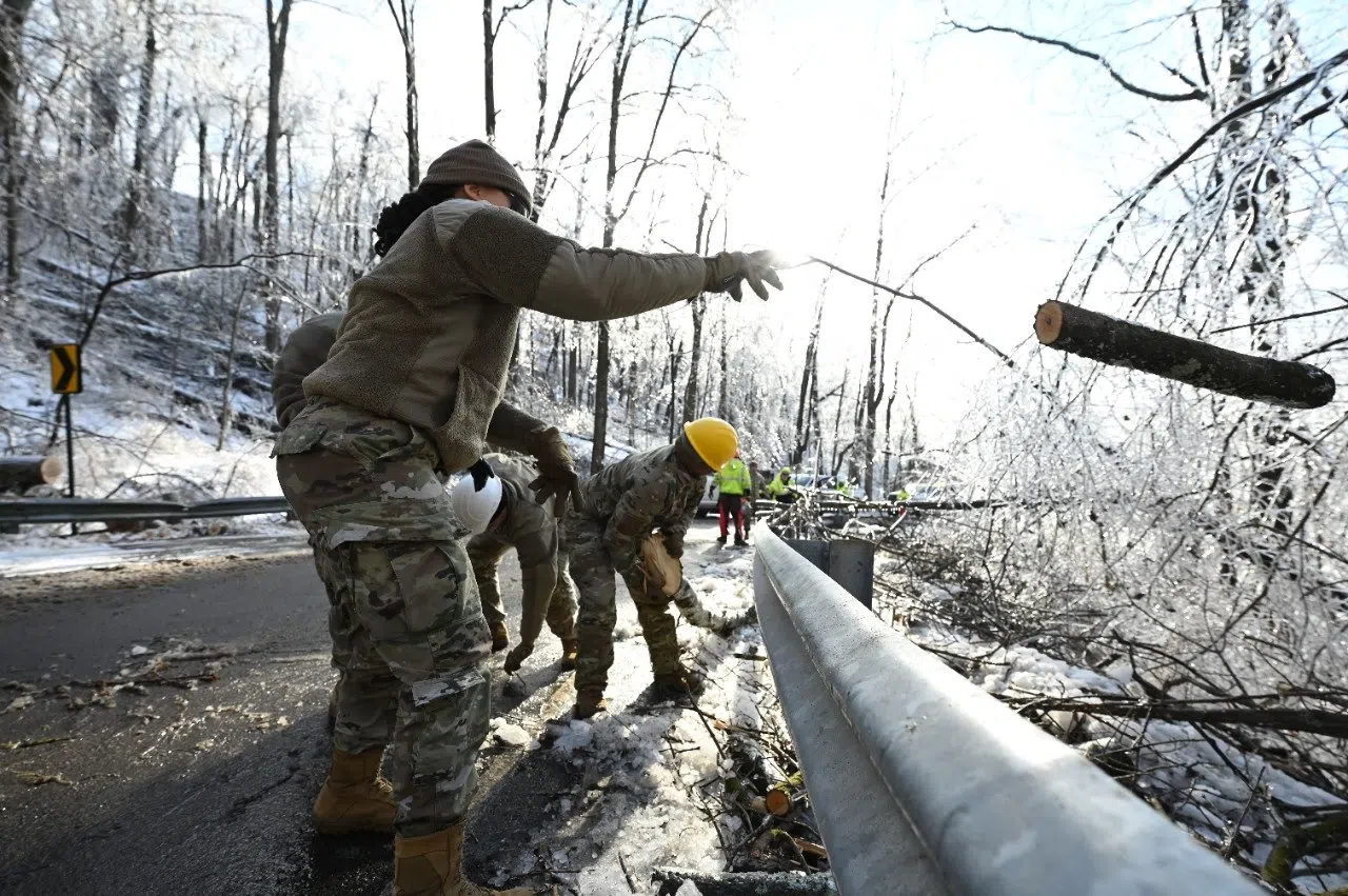 Soldiers with the Tennessee Army National Guard clear debris and assist with road clearance in Davidson County on January 28. Guardsmen are supporting state, county, and local emergency responders as they assist Tennesseans affected by the inclement winter weather. (Photo by Senior Airman Xaviera Stevens)