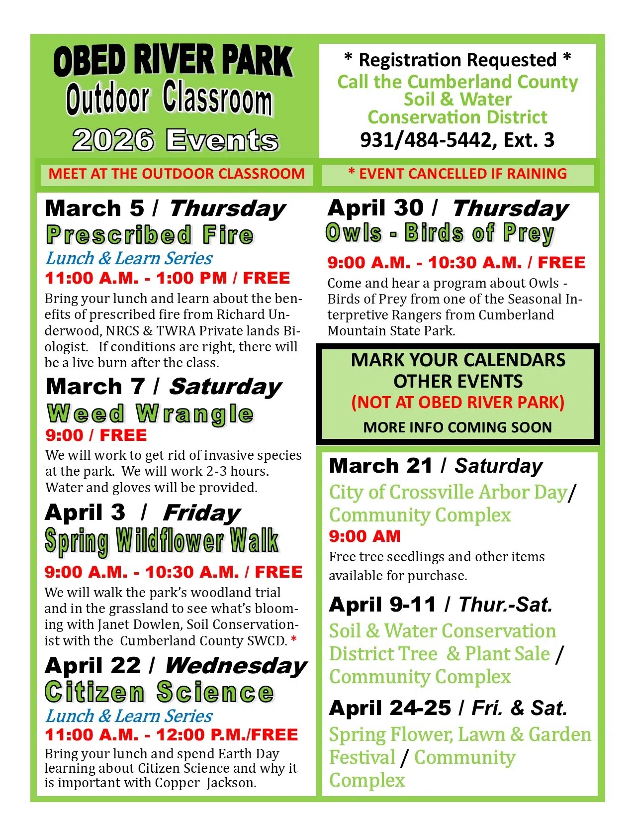 Learn about the benefits of prescribed fire at the Obed River Park & Arboretum FREE Outdoor class on Thursday, March 5th beginning at 11am and last about 1 hour. The class will be conducted by NRCS/TWRA Partner Biologist Richard Underwood. Meet at the ORP Outdoor Classroom at 24 Obed River Park Drive in Crossville. If conditions are right a live burn will commence after class on the savanna area of the park.